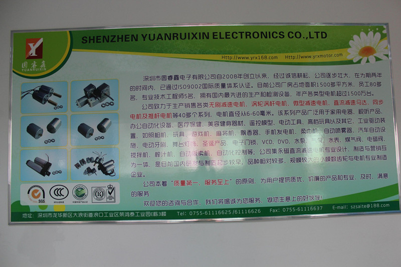 深圳市圓睿鑫電子有限公司自2008年創(chuàng)立以來,經(jīng)過誠信耕耘,在為期兩年的時(shí)間內(nèi),已通過ISO9001:2000國際質(zhì)量體系認(rèn)證。公司廠房占地面積2000多平方米,員工100人,專業(yè)技術(shù)工程師6名,擁有國內(nèi)最先進(jìn)的生產(chǎn)和檢測設(shè)備,年產(chǎn)各類減速電機(jī)超過2~300萬臺。因公司發(fā)展需要,于2020年底,將生產(chǎn)基地遷往擁有最美小鎮(zhèn)之稱的東莞市清溪鎮(zhèn),依山傍水,依托美麗的大自然環(huán)境和地方文化,全新的東莞市圓睿鑫電子有限公司將借助深圳母公司平臺,一步步走上新的臺階。 東莞公司將繼續(xù)致力于生產(chǎn)銷售各類無刷減速電機(jī) 渦輪渦桿電機(jī),微型減速電機(jī),直流減速馬達(dá),交流手搖發(fā)電機(jī)、同步電機(jī)及空心杯電機(jī)等,電機(jī)直徑從6-60毫米為定位,系列產(chǎn)品廣泛用于智能家電、智能辦公自動(dòng)化設(shè)備、智能醫(yī)療、美容健身器材、遙控模型、電動(dòng)工具、高檔玩具以及其它工業(yè)驅(qū)動(dòng)裝置,如高檔玩具、游戲機(jī)、麻將機(jī)、飄香器、手機(jī)發(fā)電機(jī)、柔巾機(jī)、自動(dòng)噴霧器、汽車自動(dòng)設(shè)施、電動(dòng)牙刷、舞臺燈飾、圣誕產(chǎn)品、智能電子門鎖、VCD、DVD、水泵、氣泵、水表、煤氣閥、電磁閥、攪拌機(jī)、榨汁...